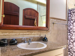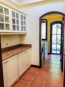 Los pisos embaldosados, las maderas amazónicas, las grandes ventanas arqueadas, las encimeras de granito, los anaqueles de madera maciza y un pequeño desván realzan el interior de la casa.