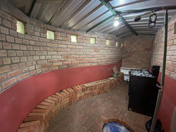 La casa principal tiene chimenea y techos abovedados con vigas de madera, 2 dormitorios y vestidor,y un amplio baño con ducha a ras de suelo con azulejos de colores y lavabo de mármol.