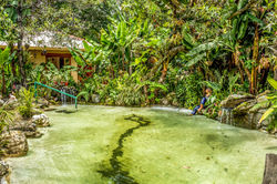 La casa, el restaurante, las cabañas con baño, el spa, los huertos, las áreas de descanso, los estanques y las fuentes de agua están todos conectados por hermosos senderos ajardinados que utilizan con buen gusto la naturaleza ya existente y la acentúan con orquídeas, flores, fuentes naturales y vegetación relajante de todo tipo. .