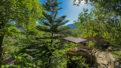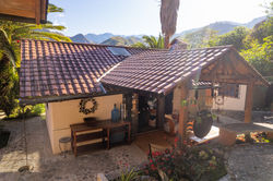 The property includes a main house, kitchen/dining room/laundry area, second bathroom/storage, and a newly constructed cabana. The property is enveloped by lush gardens teeming with vibrant flowering plants, aromatic herbs for culinary and medicinal purposes, as well as fruit trees, vegetables, berries, and coffee plants. The property is a haven for hummingbirds, creating a harmonious symphony of nature.