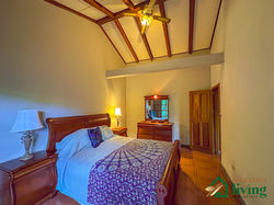 En el piso alto de la casa principal hay 2 habitaciones grandes, cada una tiene su propio baño completo, y hay una sala amplia con luz natural que viene de las ventanas grandes y pisos de madera. Desde este piso más alto, hay acceso al balcón abierto con un bar y mucho espacio. Este balcón es ideal para disfrutar las vistas panorámicas y las estrellas brillantes en la noche.